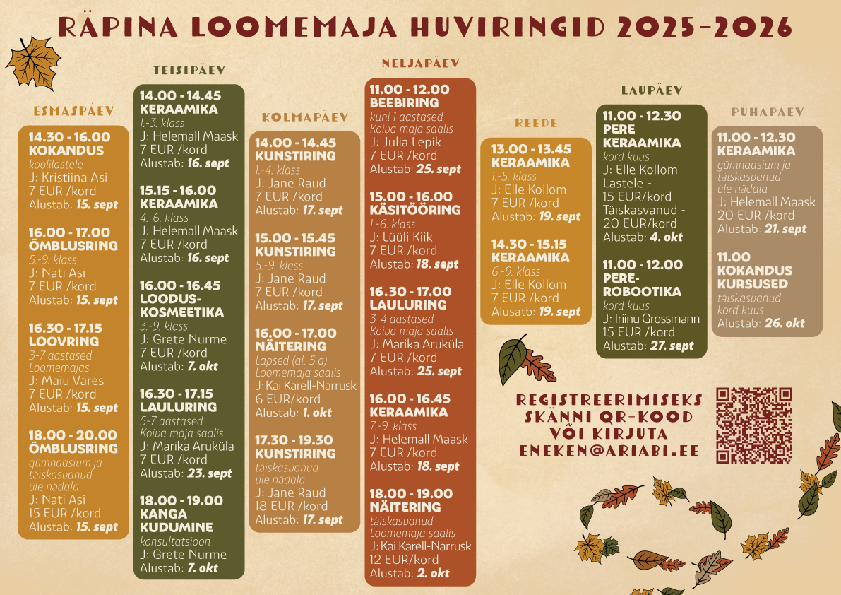 Räpina loomemaja huviringid alustavad peagi!   Ootame taas osalema nii varasemaid käijaid kui ka uusi tulijaid, kuid kindlasti tuleb enne registreeruda, mida saad teha siit: https://forms.gle/1a6HdimsnaGcmmmy9 Sel sügisel on mitu…