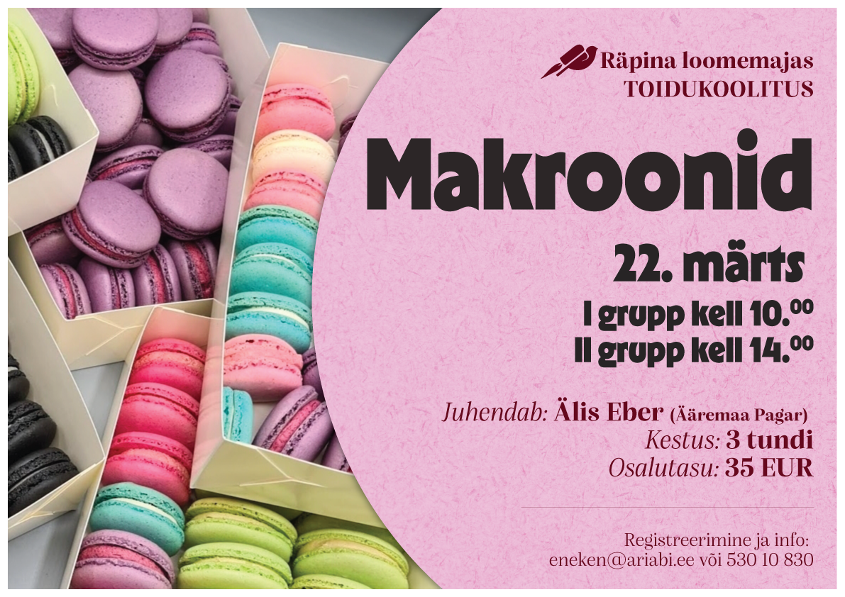 Makroonide töötuba märts, R, 2026 Magus uudis! 22. märtsil toimub Älisi juhendamisel makroonide valmistamise töötuba. Valida saab kahe grupi vahel: kell 10.00 kell 14.00 Kohtade arv on piiratud, seega ära maga maha ja registreeru kiirelt.