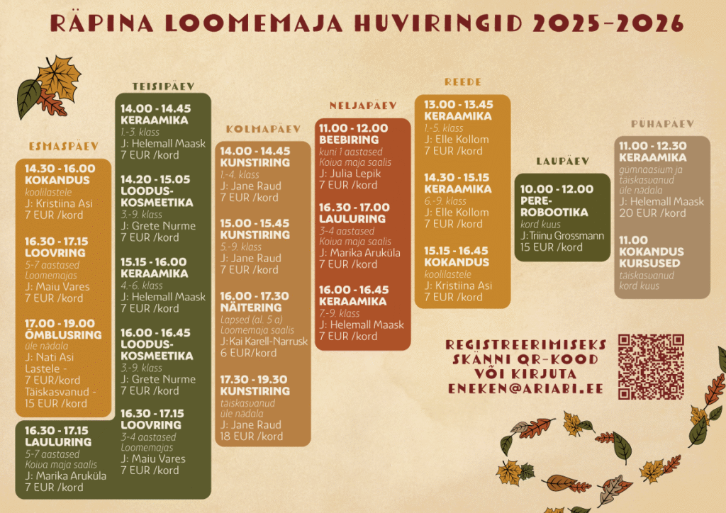 Siin toimuvad huviringid lastele, noortele ja täiskasvanutele – igaüks leiab midagi endale sobivat. Meil saab katsetada kunsti, keraamikat, käsitööd ja õmblust, õppida kokandust või looduskosmeetikat, tulla laulma, liikuma või hoopis robootikat proovima.